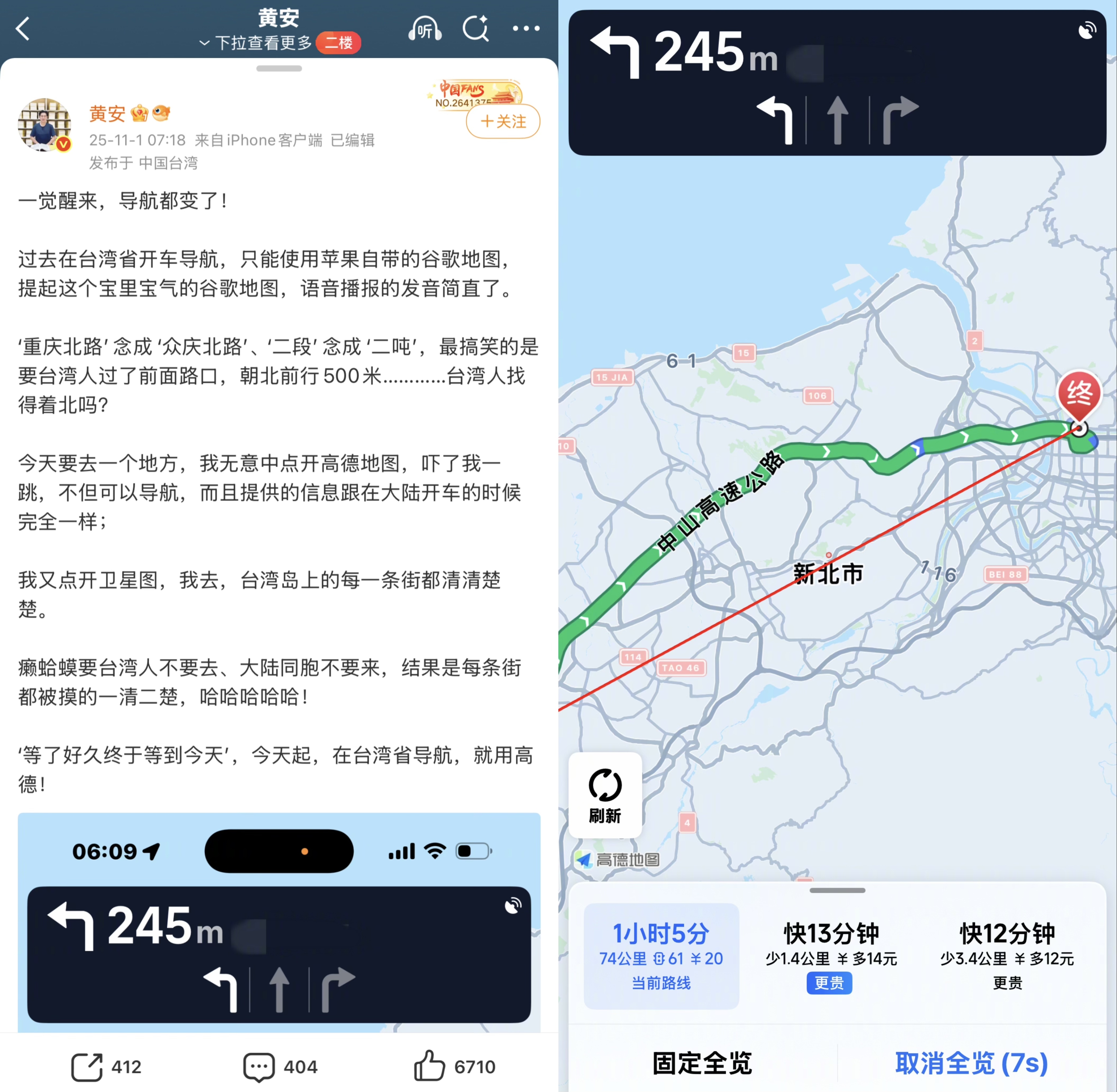 “今天要去一个地方,我无意中点开高德地图,吓了一跳,不但可以导航,而且提供的信息跟在大陆开车的时候完全一样。我又点开卫星图,台湾岛上的每一条街都清清楚楚。“黄安在文中调侃道,有人拼命要台湾人别去、大陆同胞别来,结果每条街都被摸得一清二楚。真是“等了好久终于等到今天”,从今以后在台湾省导航,就用高德!